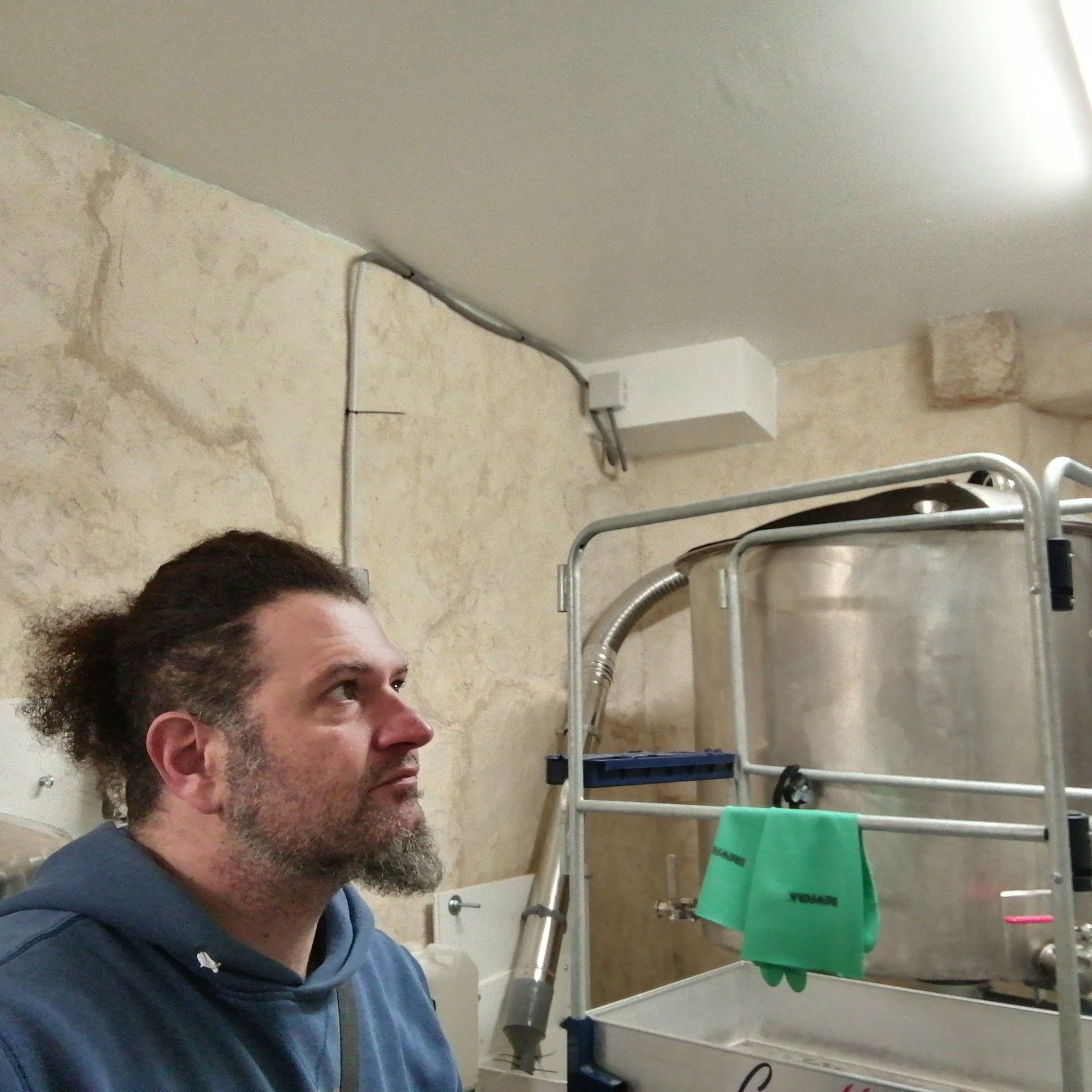 Première photo de votre humble serviteur dans sa salle de brassage à peine et tout récemment pleinement équipée il y a 5 ans... C'était la dernière inspection avant le premier brassin, et depuis il y en a eu...